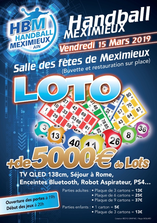 Le HBM organise son traditionnel LOTO ! Il aura lieu le Vendredi 15 Mars prochain à la salle des fêtes de Meximieux (Buvette et restauration sur place)